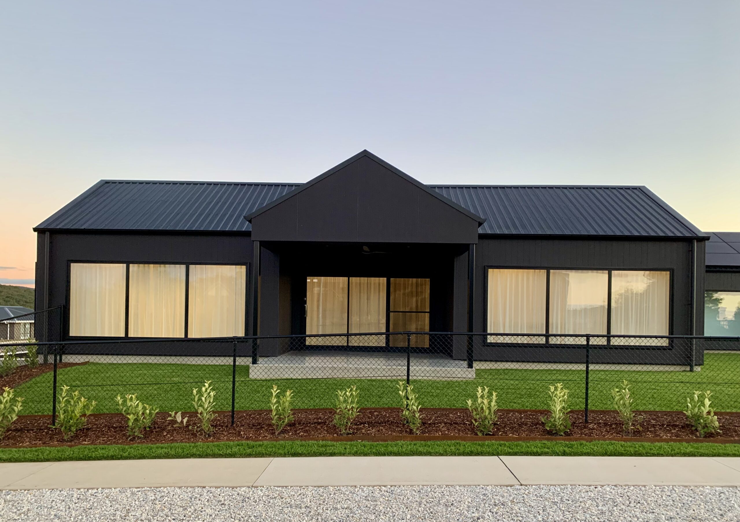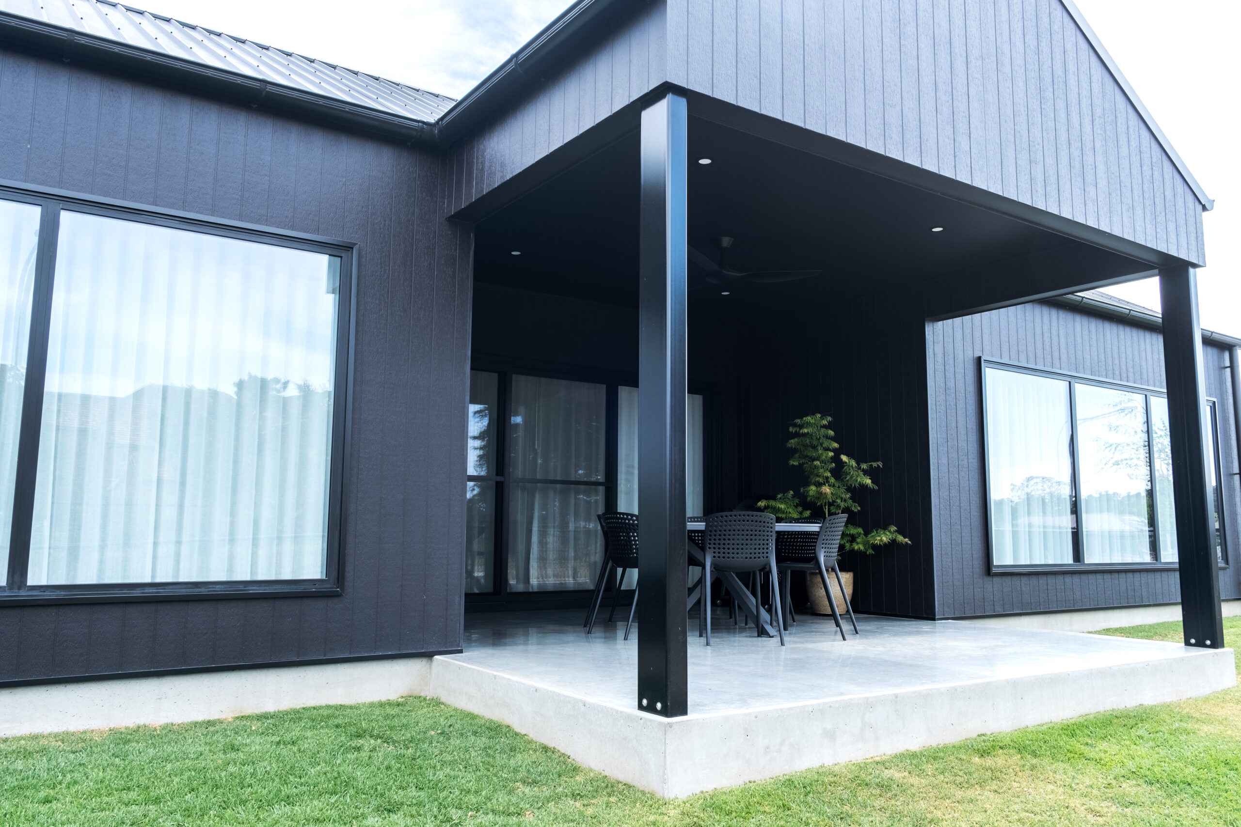The home is a pavilion style residence with a simple scandi style barn form and aesthetic. The design is minimal in material use and colour selection, featuring only off form concrete, James Hardie Axon Grained and James Hardie Matrix cladding to the exterior walls. This cladding is painted using a heat reflective Night Sky paint to minimise heat gain as far as possible.