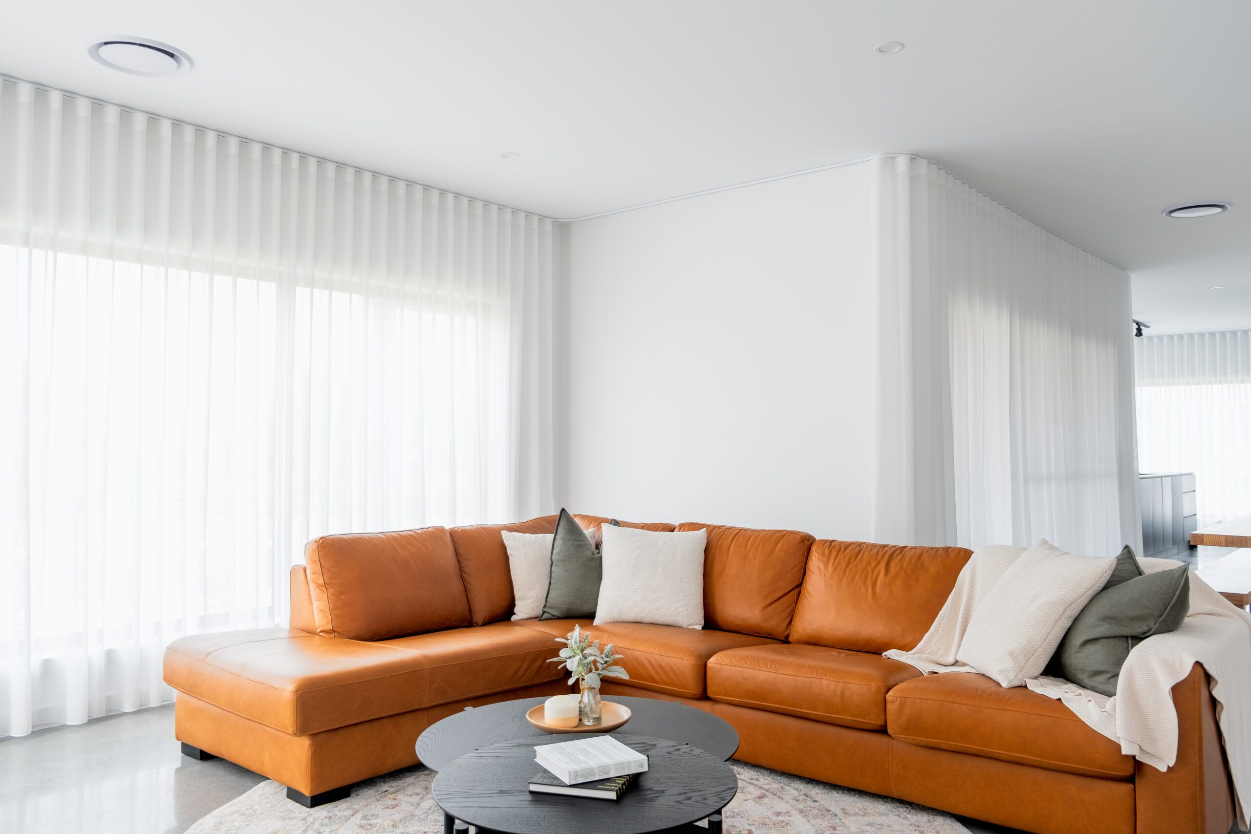 Jake Freebody, Director of Free One Building Design, designed his own home that reflects his family’s style, enhanced by our locally made Double Curtains and Roller Blinds.