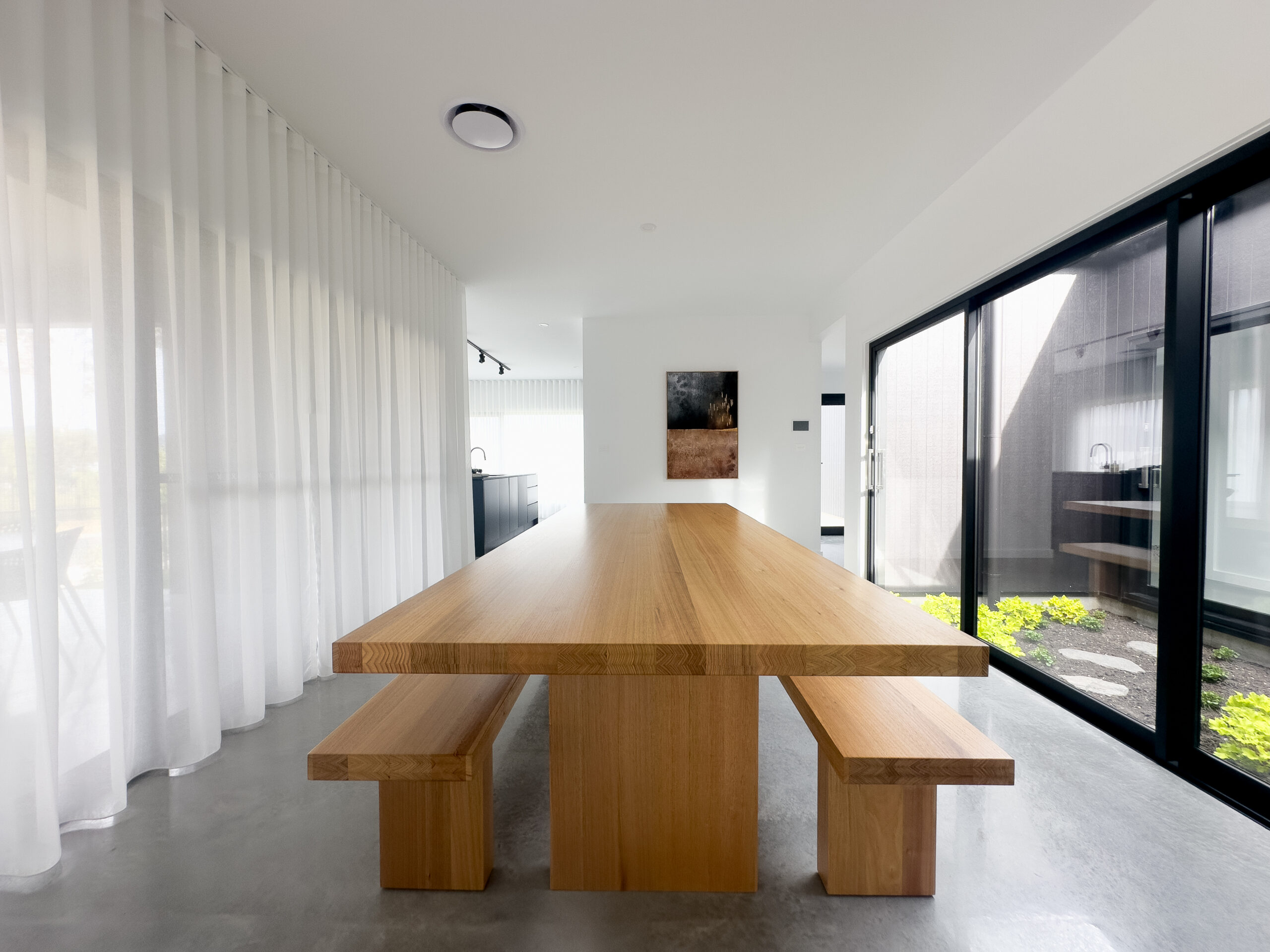 The interior spaces feature a neatural colour palette, with burnished concrete floors and white-on-white walls and ceilings. This minimal aesthetic allowed us to add our own style through furniture and artwork selections.