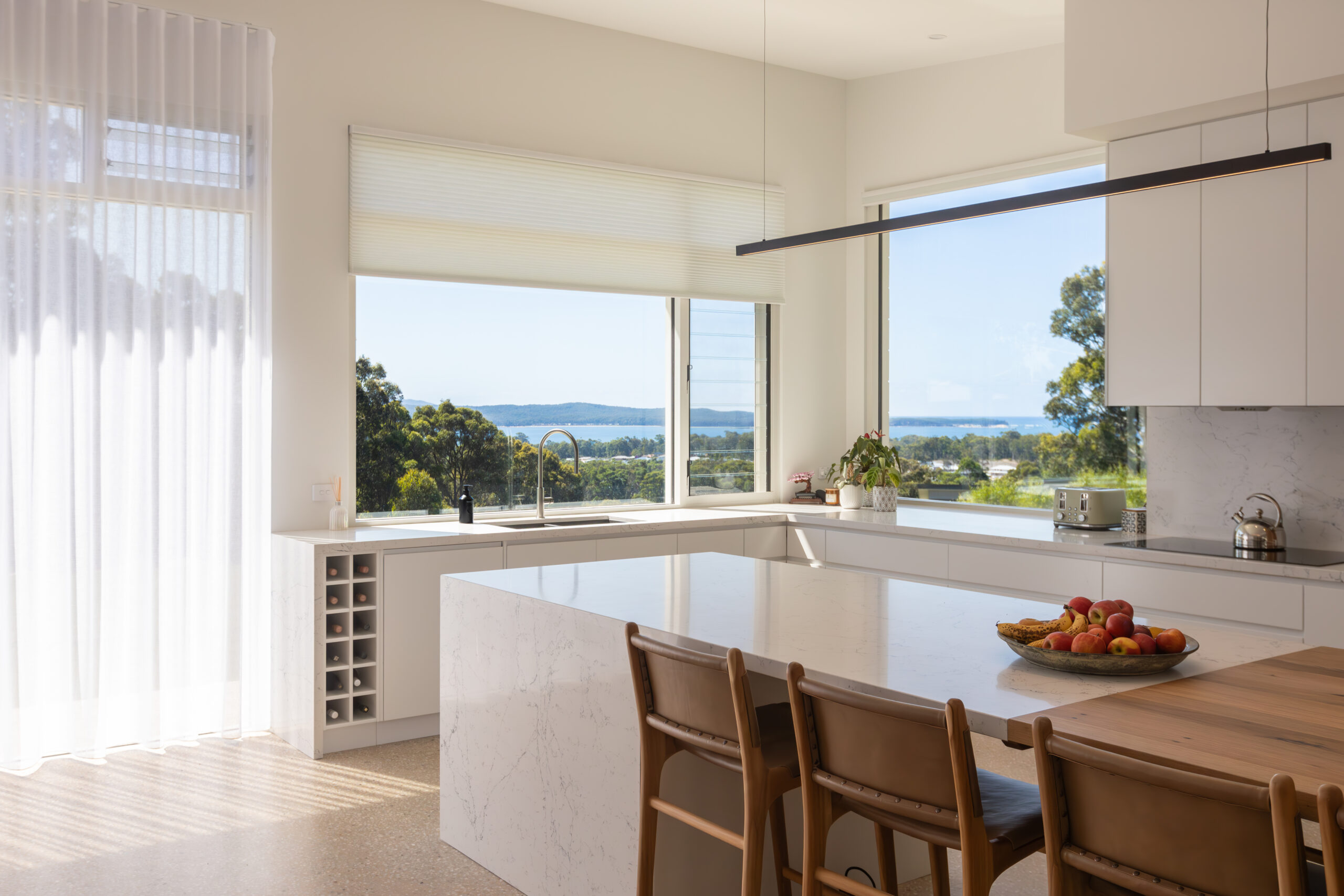 Having secured a block of land with stunning views over the azure waters of Batemans Bay itself, they worked with an architect to design a spacious home that would offer the ultimate low-maintenance, holiday-at-home lifestyle for the couple and their teenage sons.
