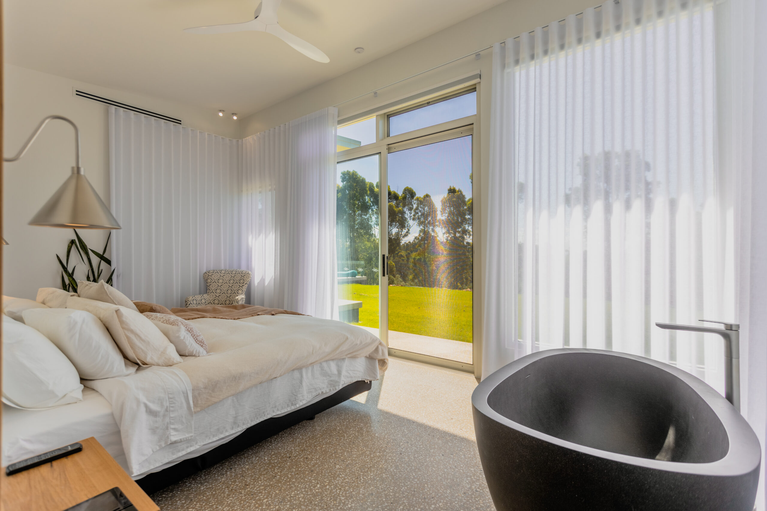 Sharon chose dollar curtains + blinds Batemans Bay store to design, manufacture and install Curtains, Blinds and Awnings throughout the home.
