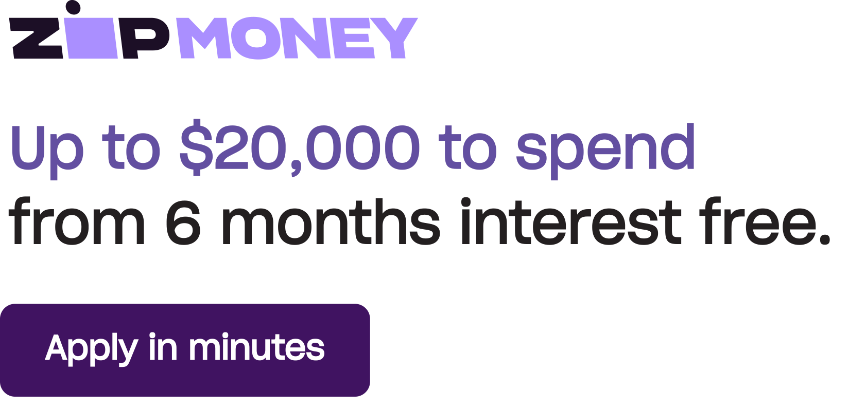 *Zip Money – Interest free term subject to minimum spend and promotional partner offer. Available to approved applicants only and subject to completion of satisfactory credit check. Minimum monthly repayments are required. Paying only the minimum monthly repayment amount will generally not repay the purchase within the interest free period. A monthly account fee of $9.95 will also apply and a one-off establishment fee may apply for new customers.