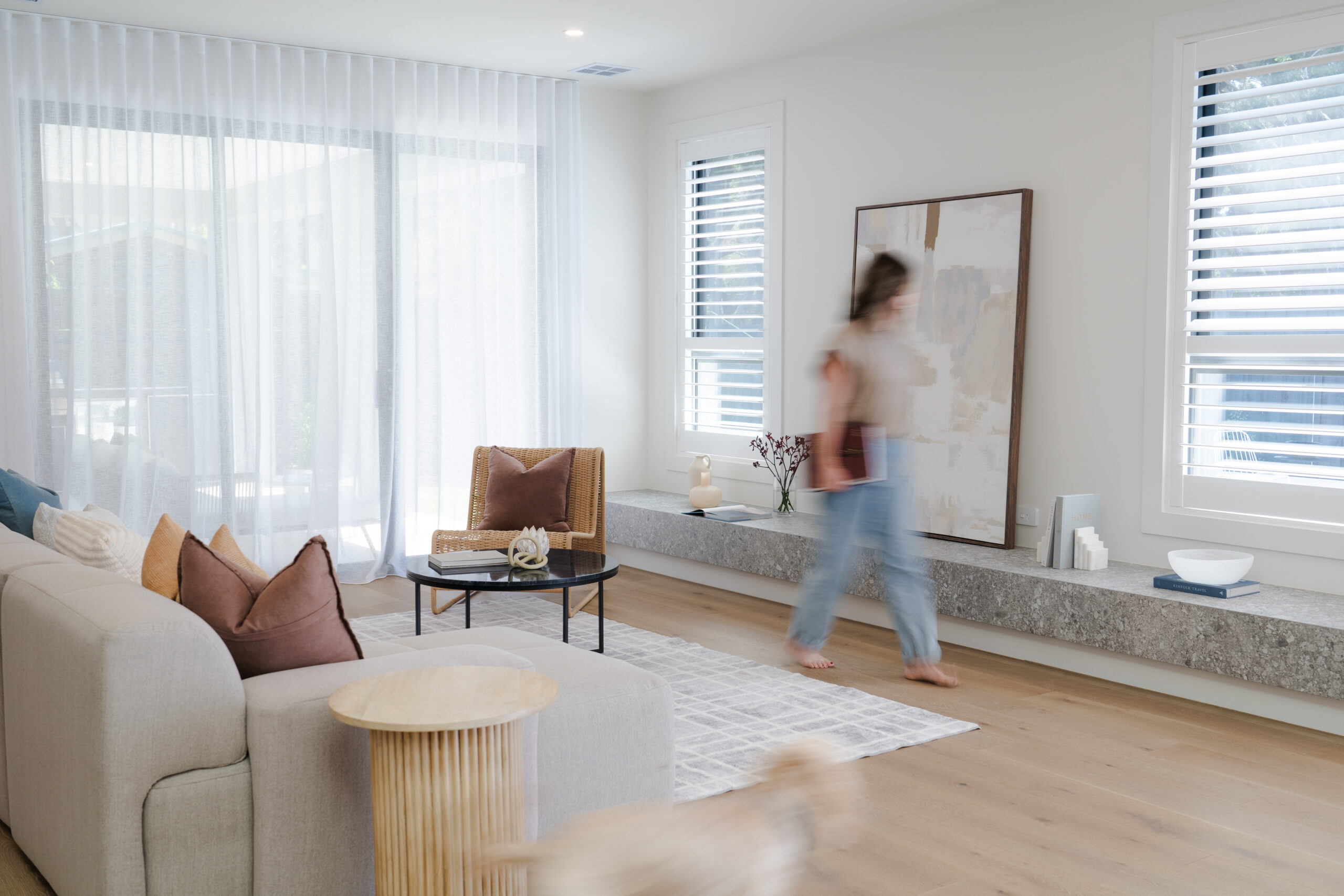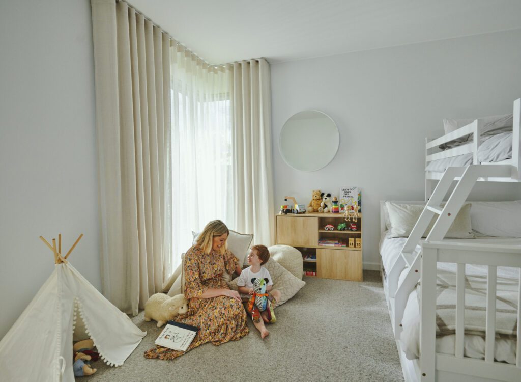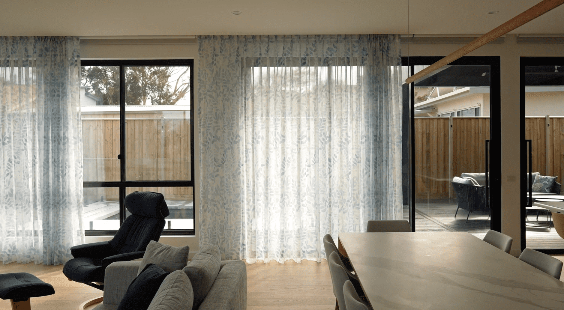 Jake Freebody, Director of Free One Building Design, designed his own home that reflects his family’s style, enhanced by our locally made Double Curtains and Roller Blinds.