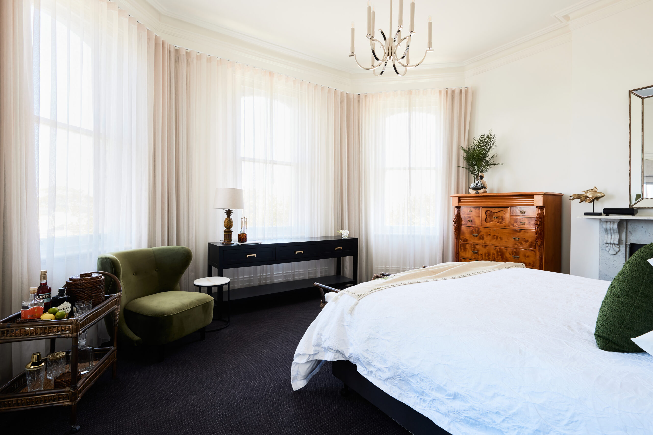 The Royal Queenscliff blends 1850s heritage with modern luxury in their stunning refurbishment. We enhanced the refined, coastal design with our custom made Double Curtains and Roman Blinds.