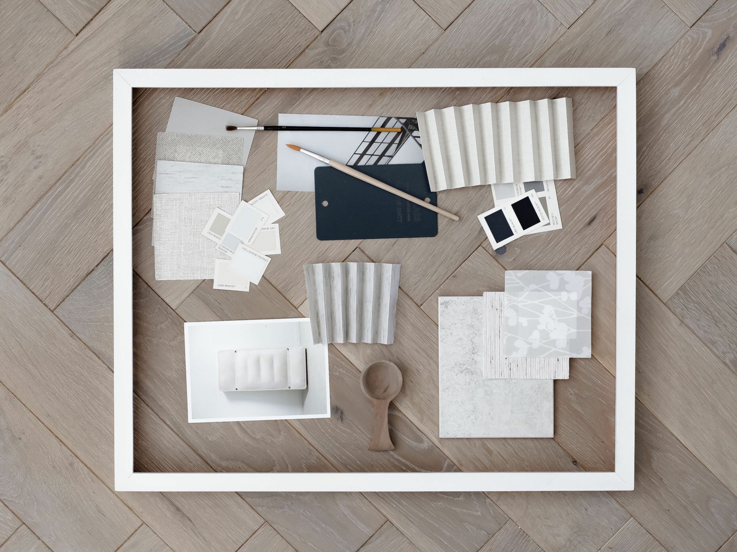 Start by creating a mood board with some of the materials and colours you already have in the room. In the mood board below, the key elements I’ve included are the light oak herringbone floor, the black metal accents and the worktop sample. Once I had these in place I then played around with different fabric and paint swatches to come up with a range of options that would work together.